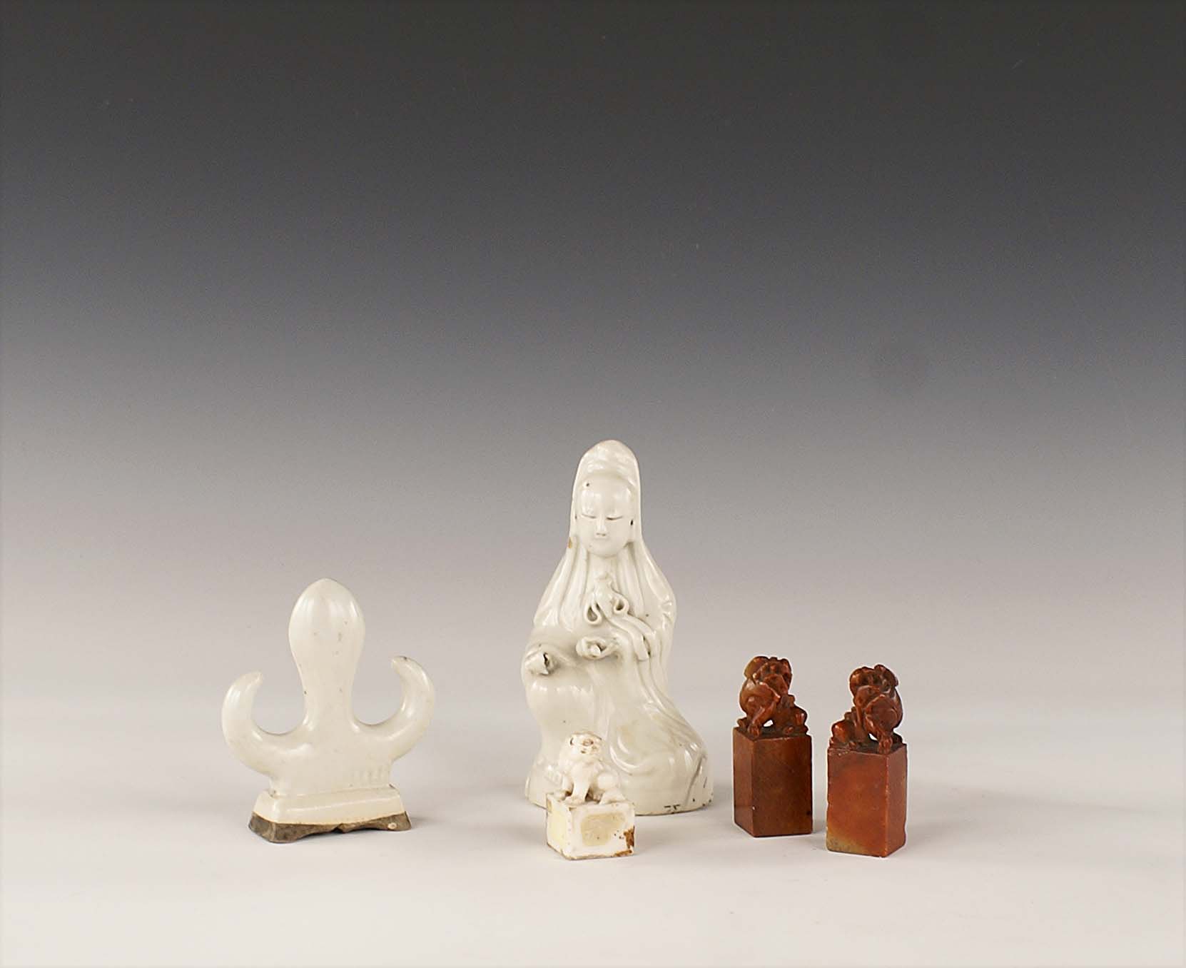 Lotto 849 | Lotto composto da tre oggetti in ceramica smaltata e due cani di Pho in...