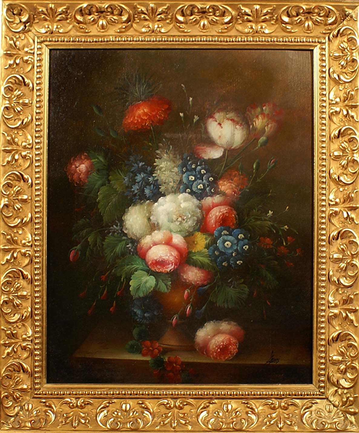 Firma indecifrabile, "Natura morta con vaso di fiori", olio su tela, cm. 50x40, firmato in basso a destra.