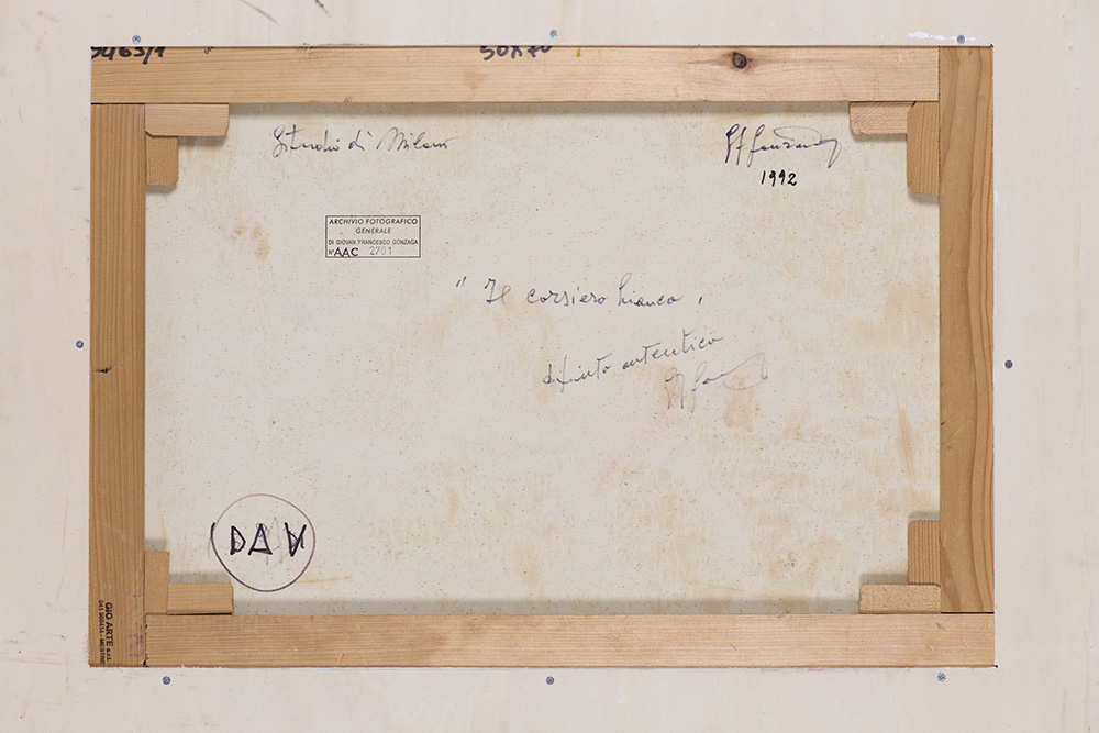 Firma, datazione, titolo, dichiarazione di autenticità e iscrizione "Studio di Milano" al retro