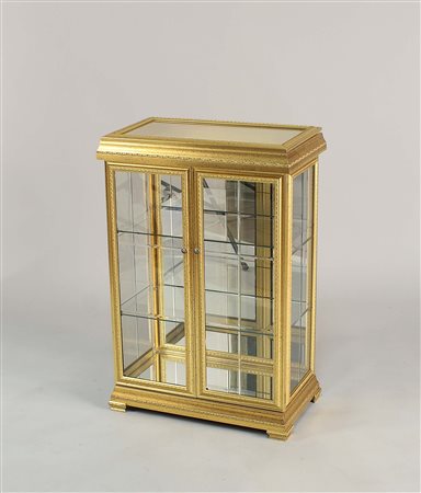 Mobile vetrina in legno tinto noce, fronte con uno sportello e due ripiani...