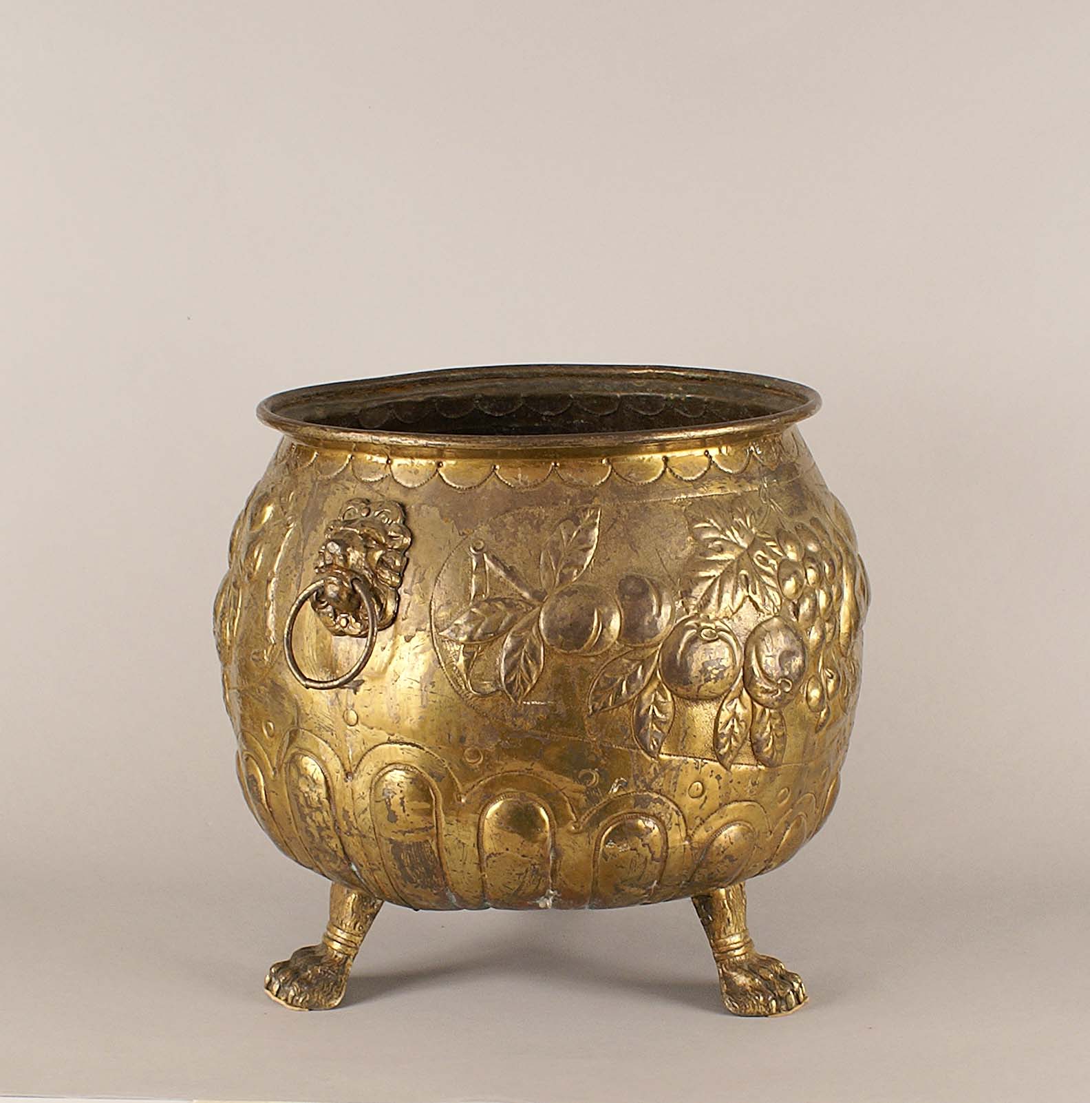 Cachepot in metallo dorato e sbalzato a motivi di frutta poggiante su tre piedini ferini, vecchia manifattura, h. cm. 35, d. cm. 41.