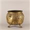 Cachepot in metallo dorato e sbalzato a motivi di frutta poggiante su tre...