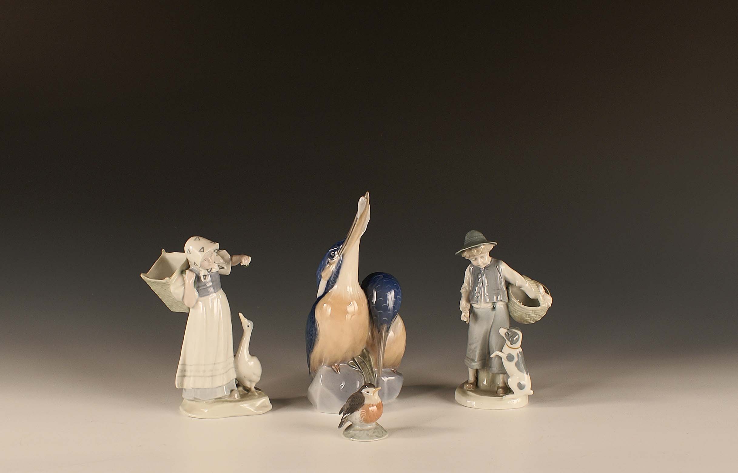 Lotto composto da quattro gruppi in porcellana policroma, Danimarca, vecchia manifattura, fogge e misure diverse.