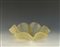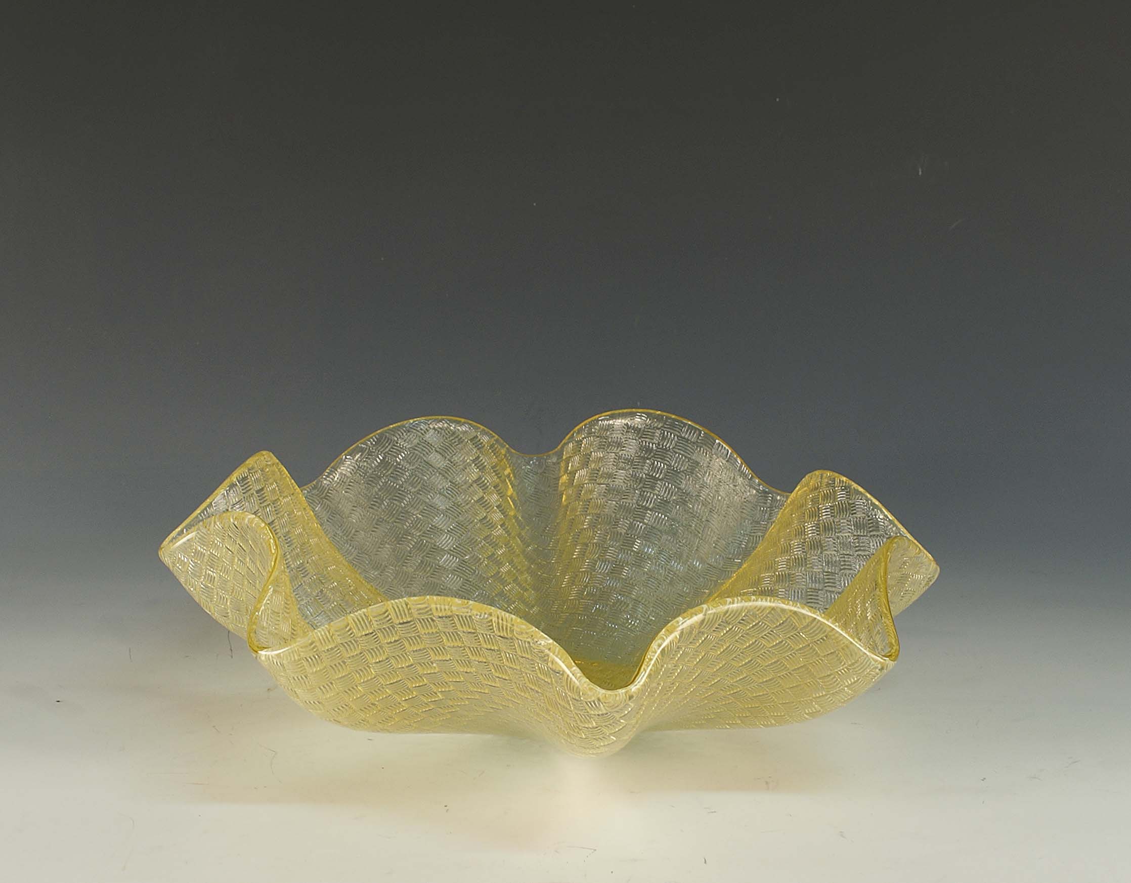 Centrotavola in vetro trasparente nelle tonalità del giallo, lavorato a motivo di cestino intrecciato, con profilo smerlato, Murano, vecchia manifattura, cm. 10x28x28.
