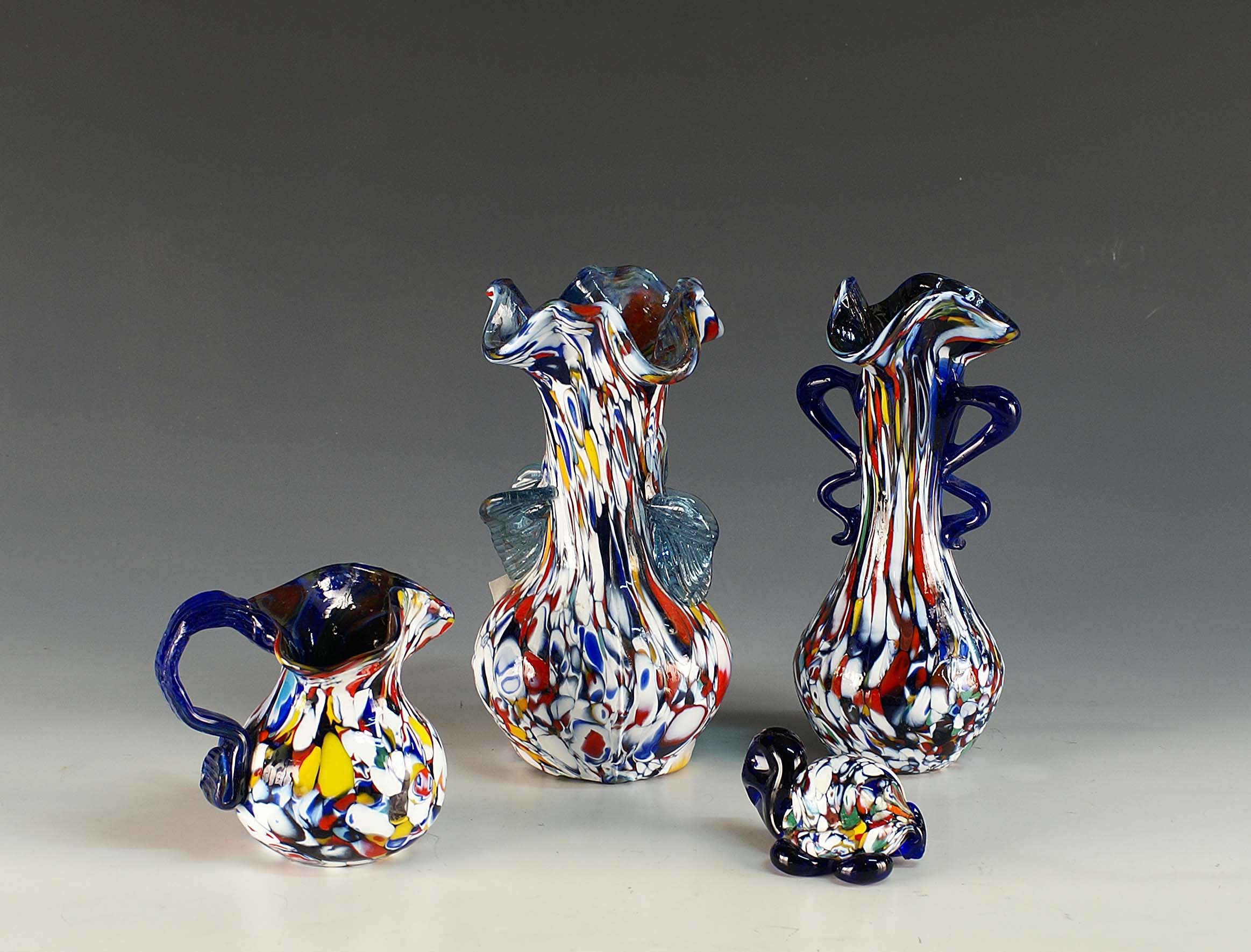 Lotto composto da quattro oggetti in vetro nelle tonalità del blu cobalto con sfumature di colore, Murano, anni 50/60, fogge e misure diverse.