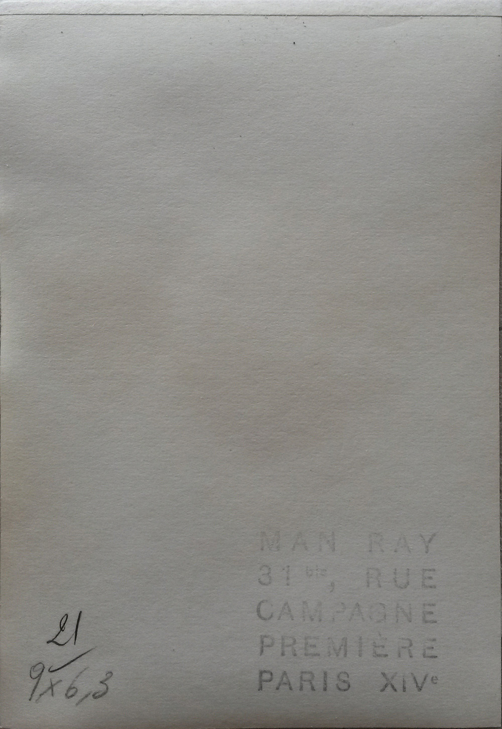 Timbro al retro con indirizzo dello Studio Man Ray presso il quale è stata scattata la fotografia: «MAN RAY 31, RUE CAMPAGNE PREMIERE PARIS XIV»