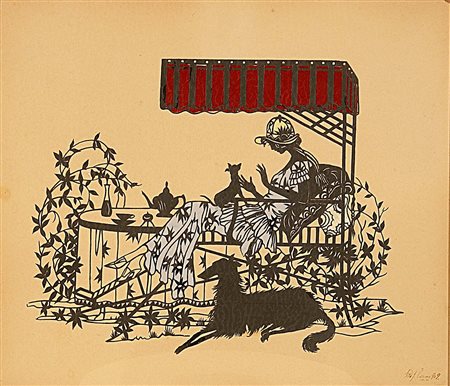 Scuola francese del XIX secolo, "L'ora del the", silhouette e tecnica mista, cm. 23x27x20, firmata e datata 1939 in basso a destra.