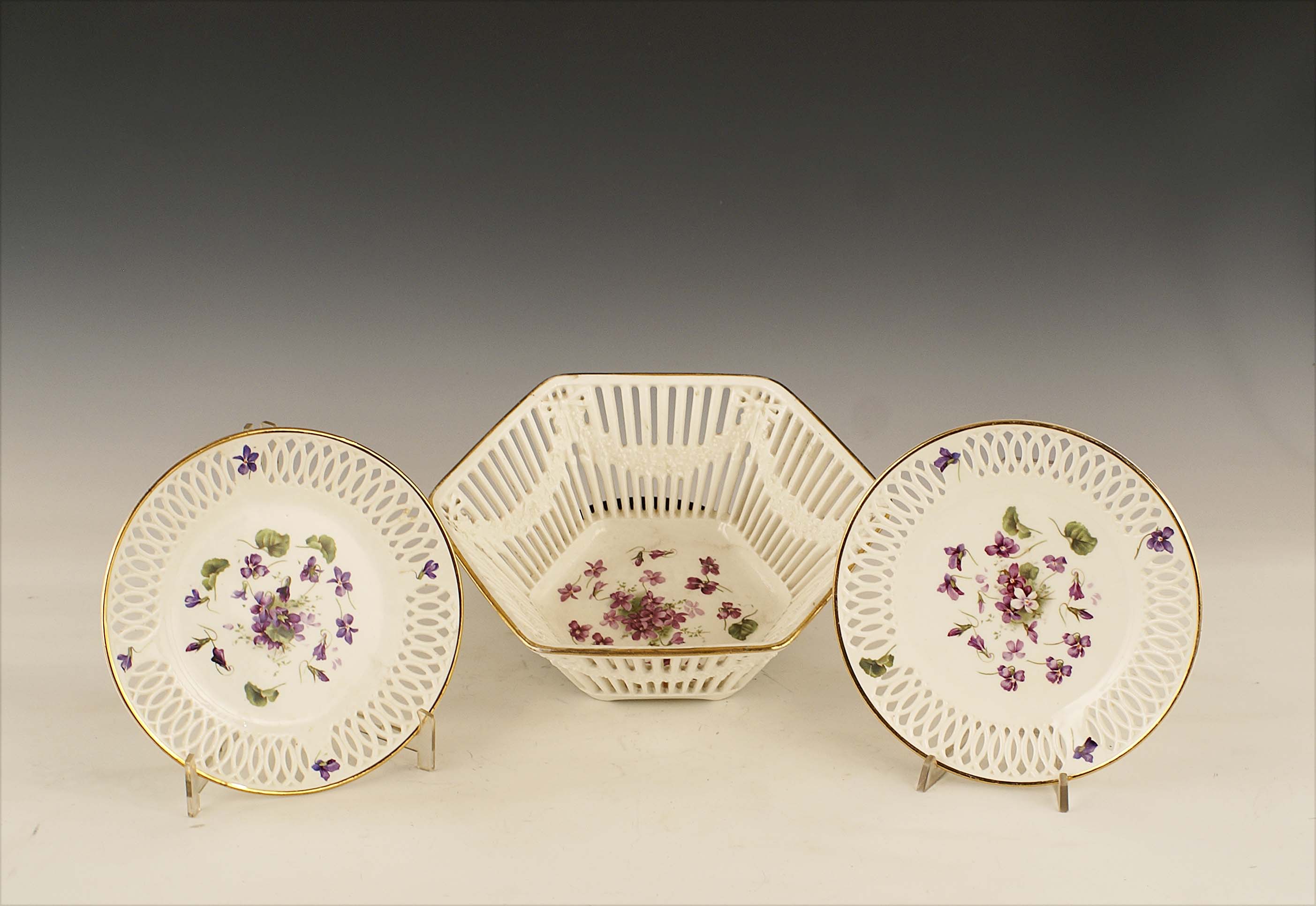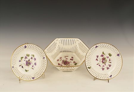 Set composto da un centrotavola e dieci piattini in porcellana bianca decorata a motivo di violette, vecchia manifattura.