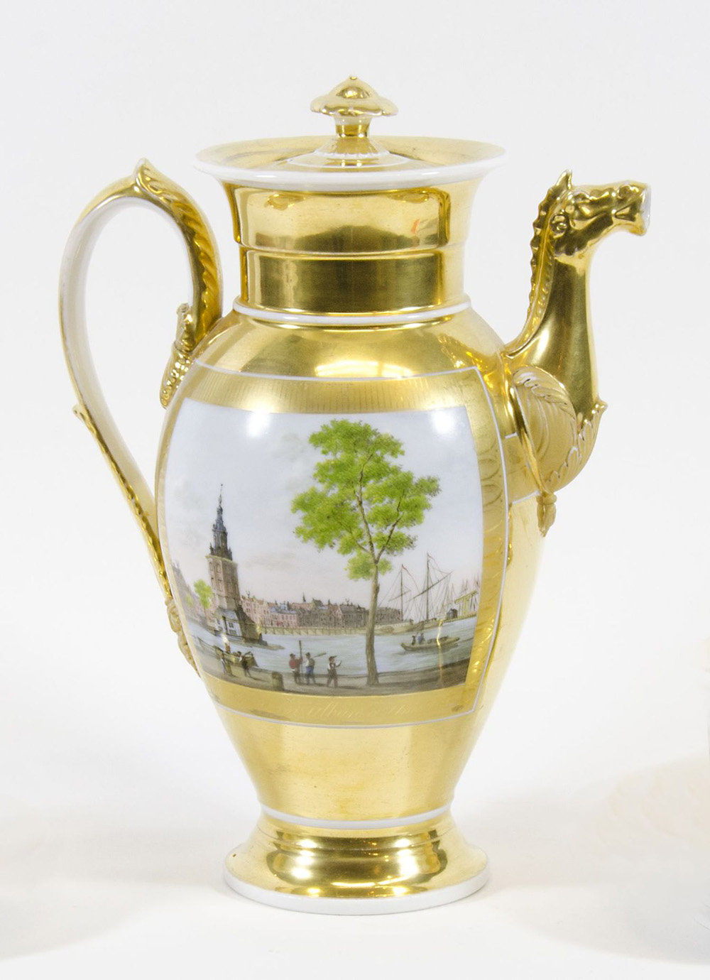 Lotto composto da coppia di tazze in porcellana dorata con piattini e teiera, decorate con paesaggi olandesi al centro. Fine XIX secolo.