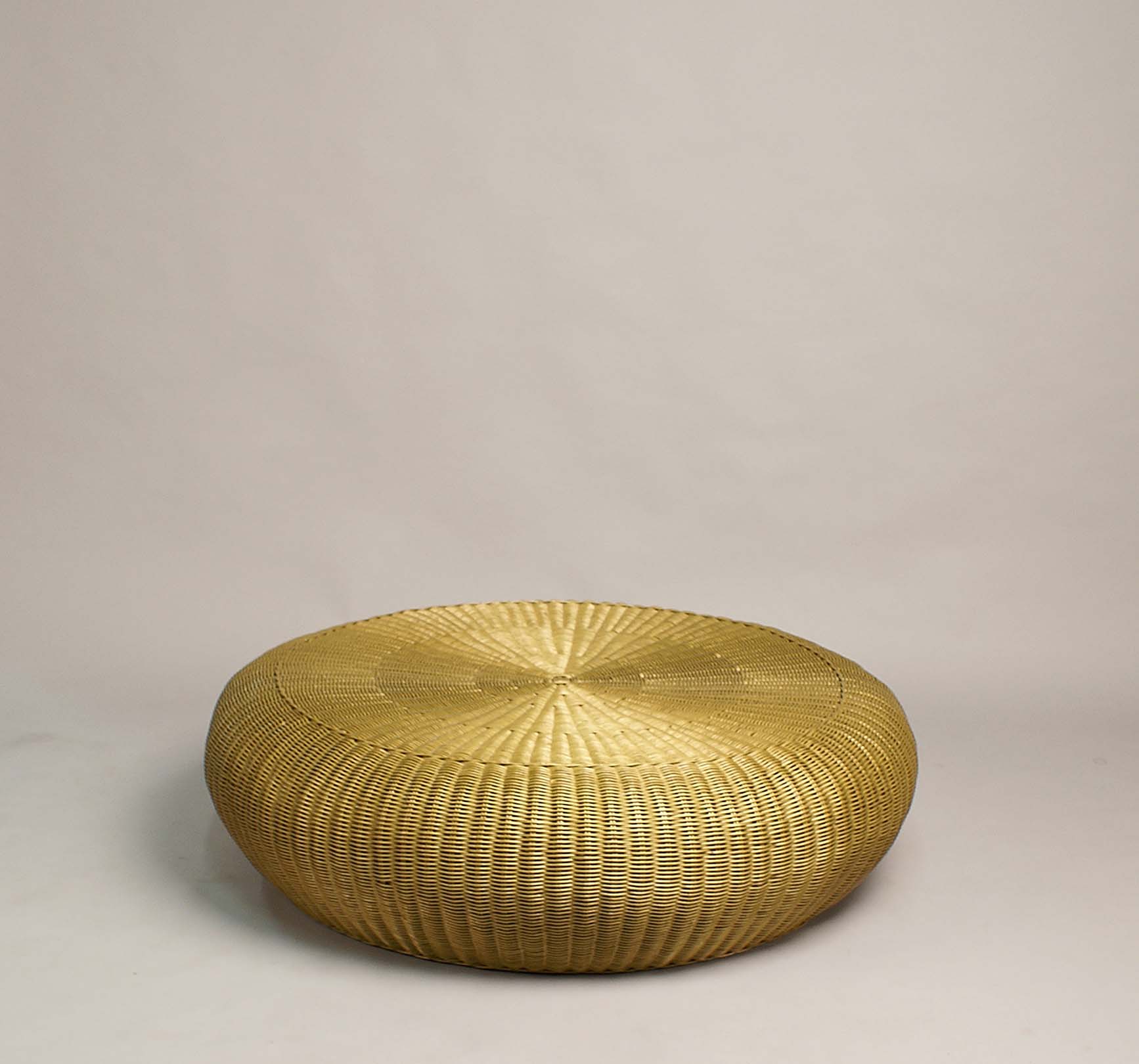 Particolare tavolino basso in vimini dorato, h. cm. 30, d. cm. 114.
