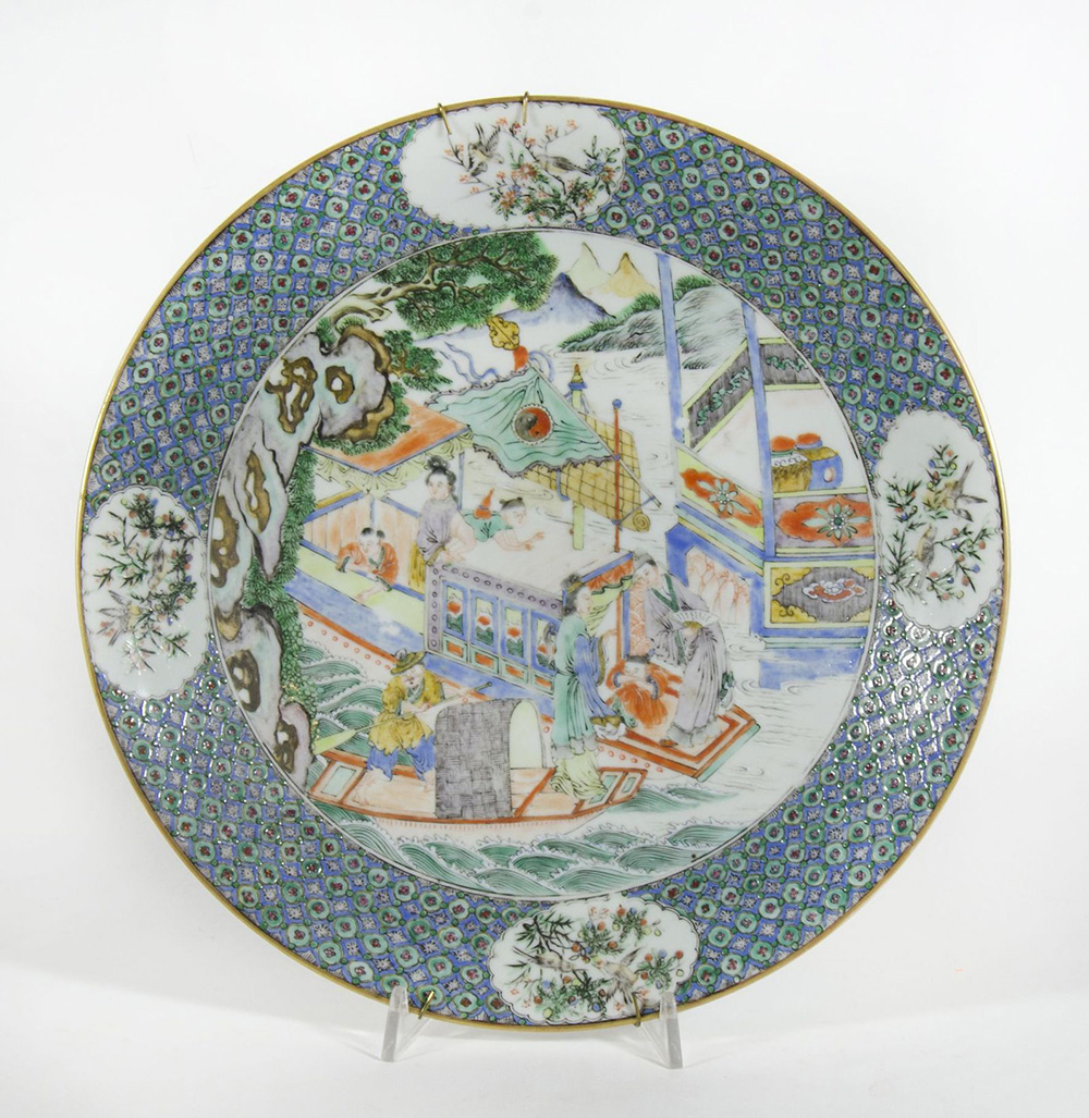 Piatto in porcellana policroma decorato con scene orientali. Diam. cm. 35.