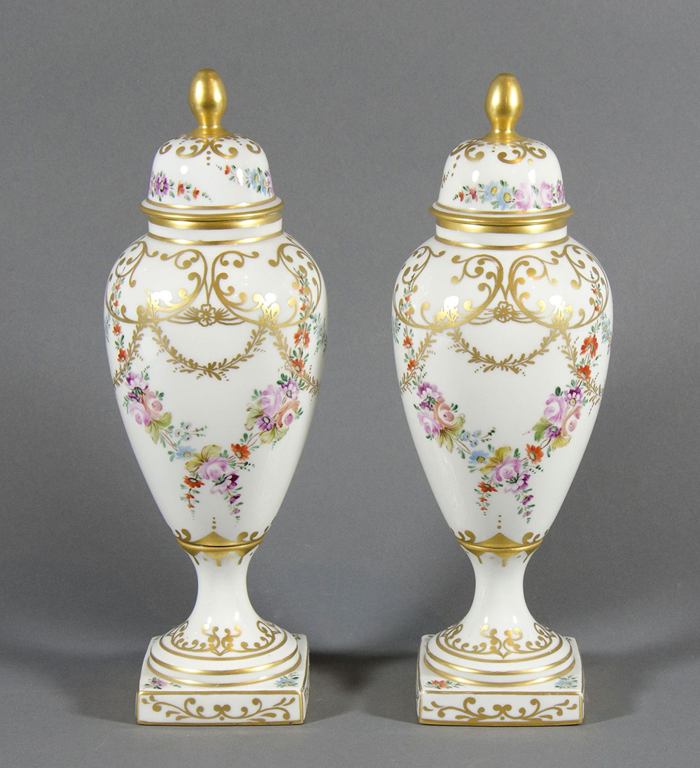 Limoges: coppia di vasi in porcellana con decori floreali, con coperchi. H....