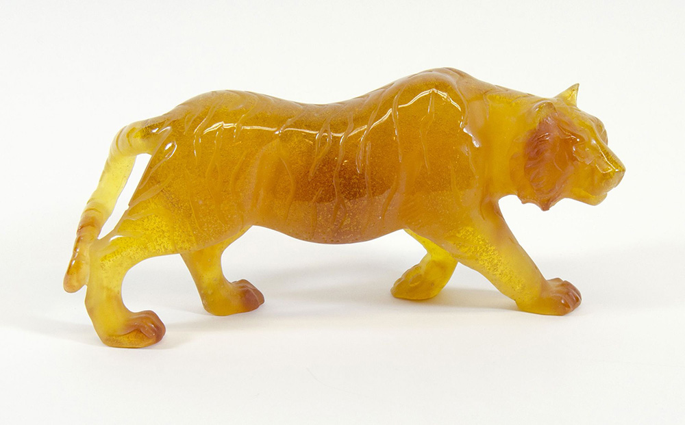 Scultura in vetro arancio raffigurante tigre. Lung. cm. 27.