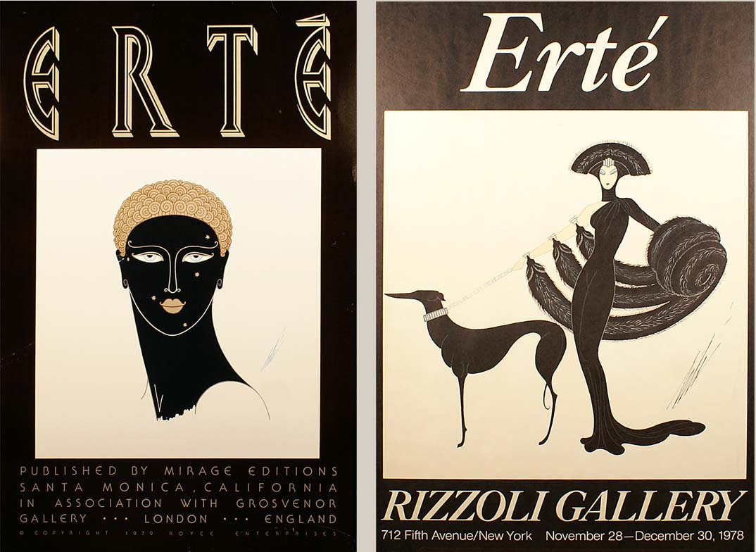Lotto composto da due affiches ErtÌ entro cornice, misure diverse.