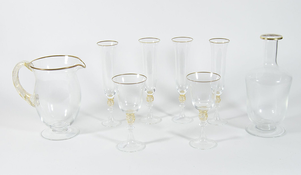 Servizio di bicchieri in vetro di Murano con decori dorati, composto da 50 pezzi.