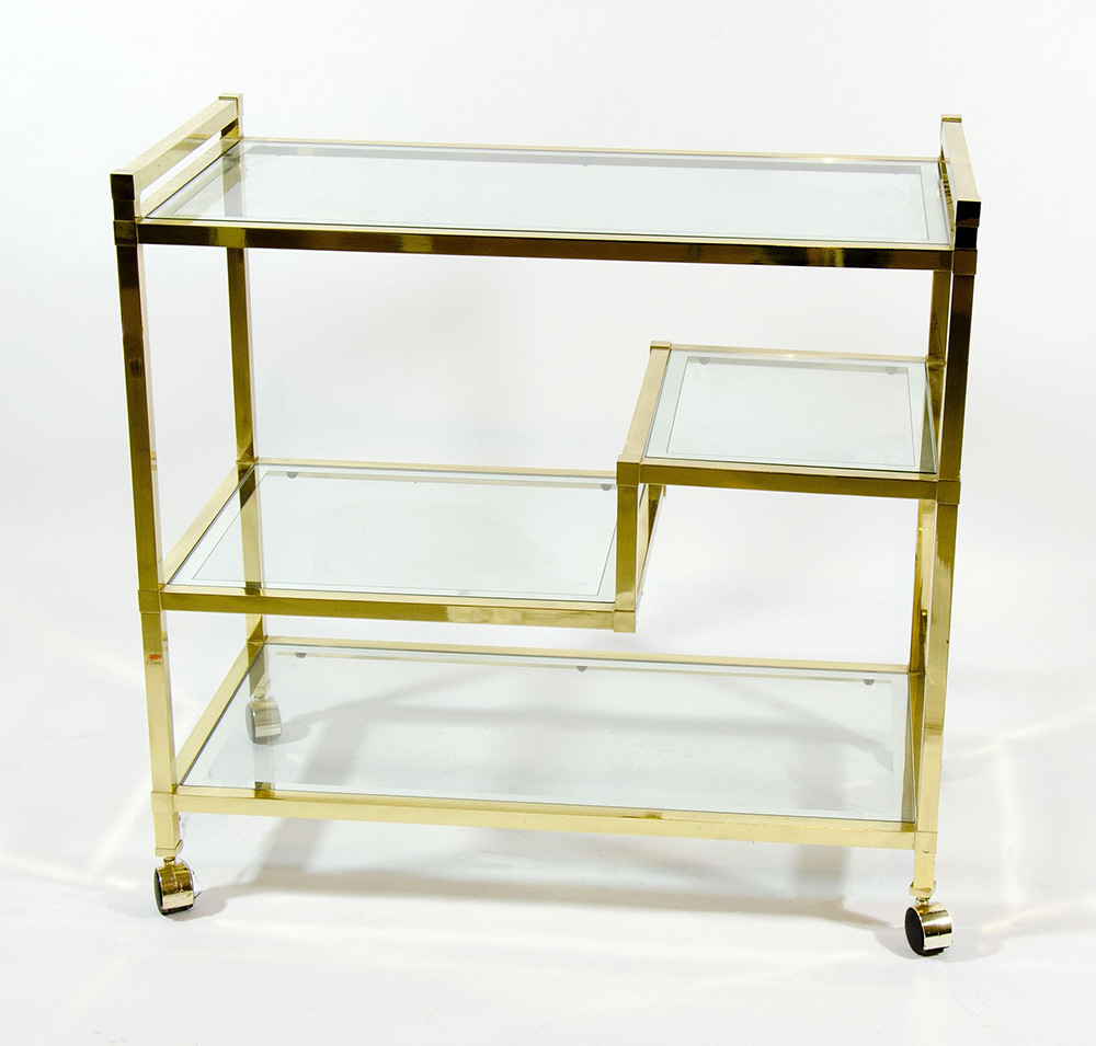 Carrello in ottone dorato con 4 ripiani in vetro.
