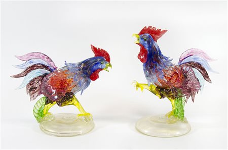 Due sculture in vetro policromo raffiguranti galli. Lung. cm. 25. (difetti).