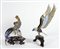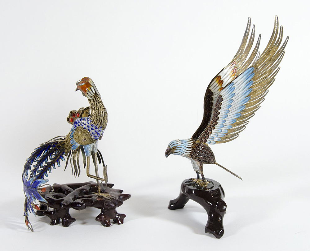 Due sculture in argento finemente lavorate a filigrana e smalti policromi raffiguranti uccelli, su basi in legno. H. max cm. 27.