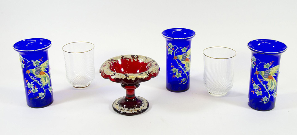 Lotto di 6 oggetti in vetro tra cui piccola alzata decorata.
