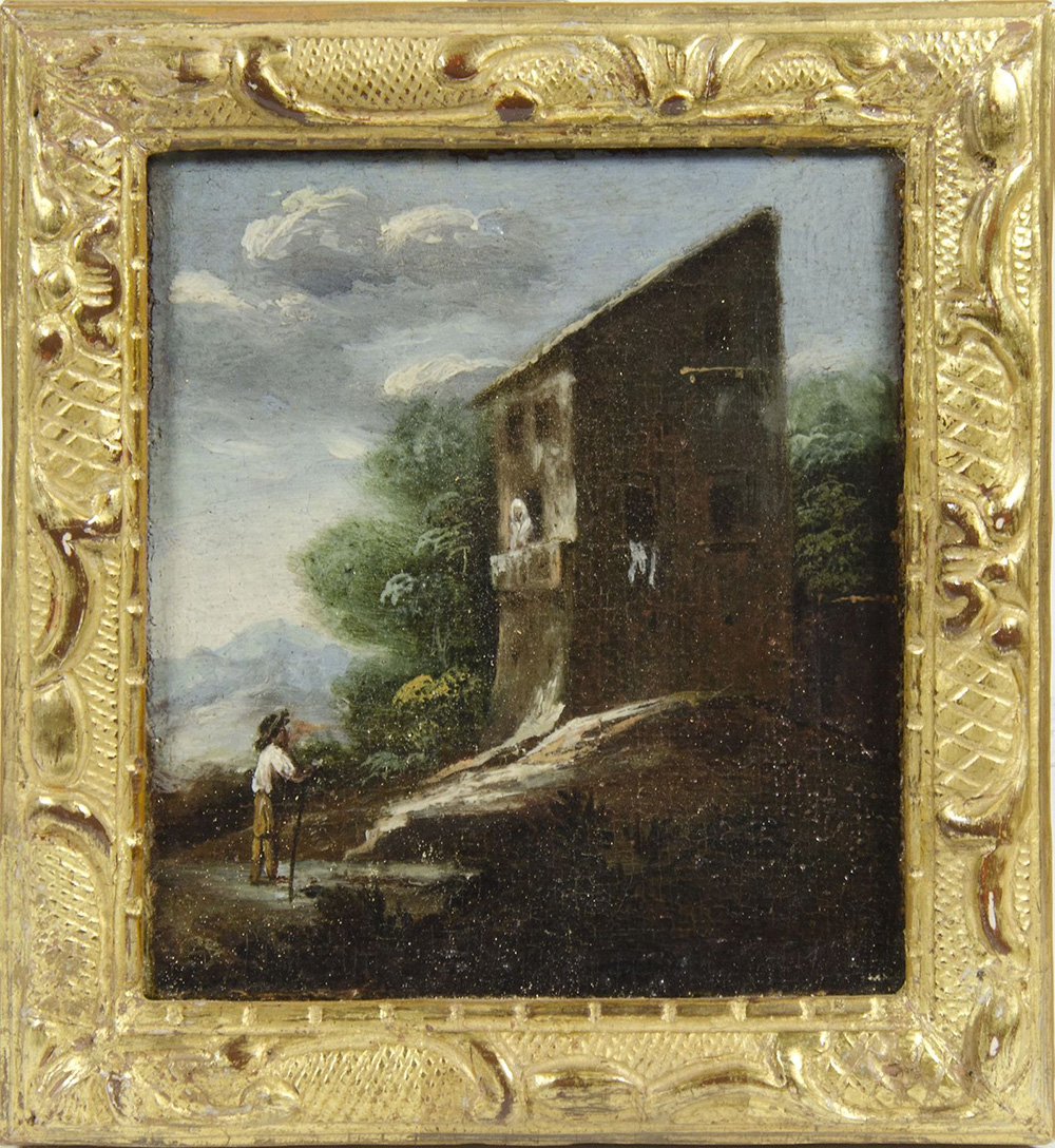 Ambito di Alessio De Marchis 1684-1752 Lotto di 2 oli su tela foderata raffiguranti paesaggi, cm 12x10.