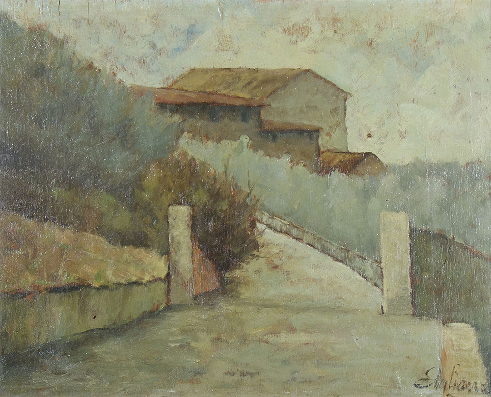 Pittore del '900 "Vicolo con case" cm. 38x47 - olio su compensato Firmato b. a d.