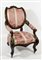 Poltrona in legno scuro con seduta e schienale rivestita con stoffa decorata. XIX secolo.