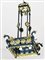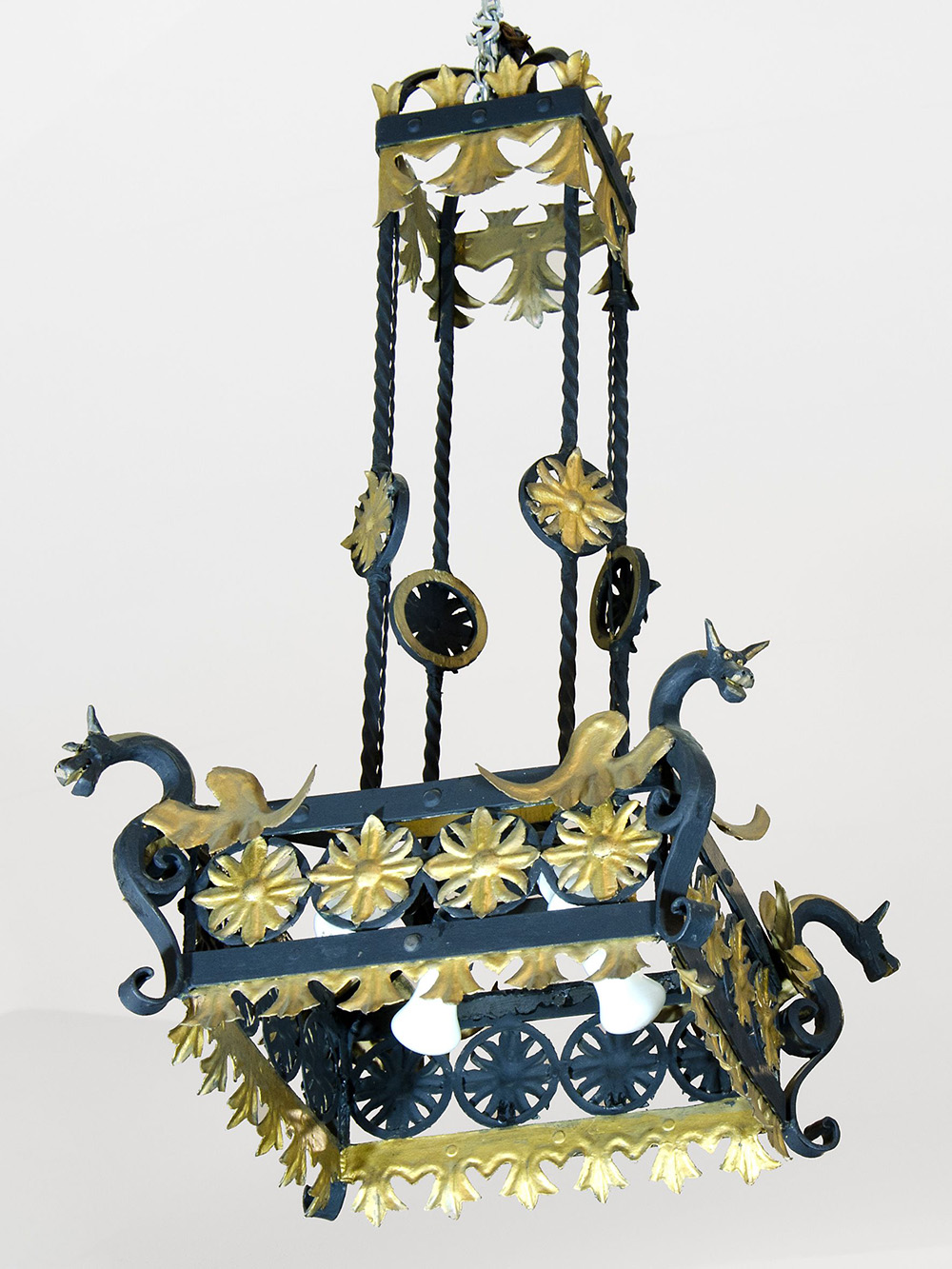 Lampadario in ferro battuto e dorato a sezione quadrata.