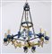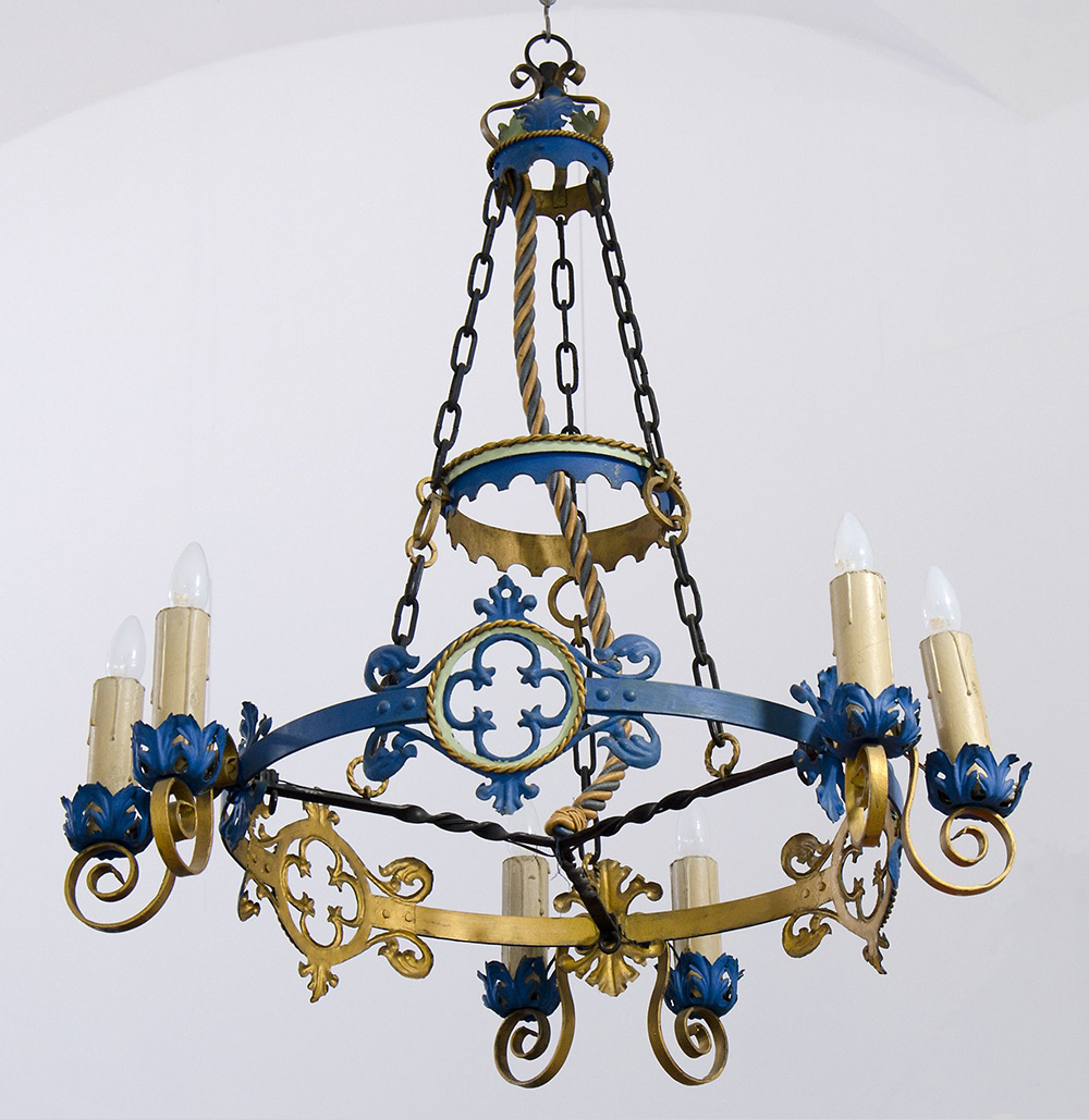 Grande lampadario in ferro battuto dipinto e dorato a sezione rotonda, a 6 luci.