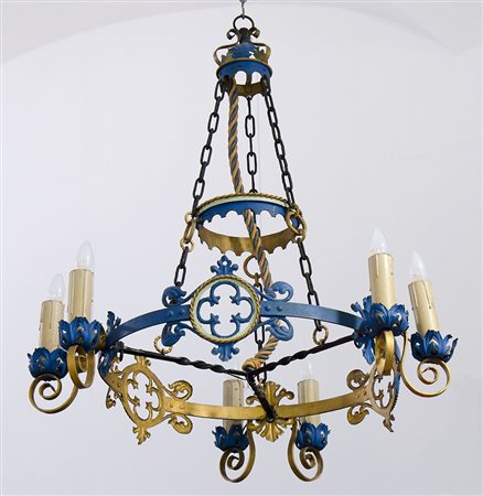 Lotto 170 | Grande lampadario in ferro battuto dipinto e dorato a sezione rotonda, a 6 luci.