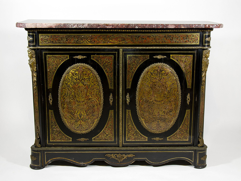 Credenza a 2 ante in legno nero e lavorazione boulle, intarsi e fregi in metallo dorato, piano in marmo. cm. 110x138x40.