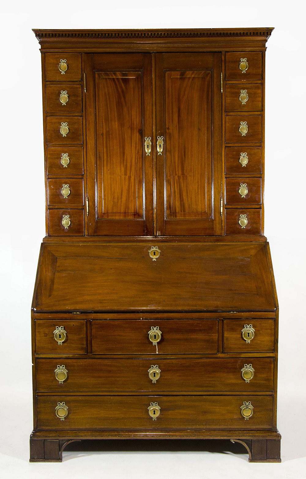 Credenza a doppio corpo in legno, parte inferiore a 5 cassetti e calatoia, parte superiore con 2 ante centrali e 10 cassetti laterali. cm. 215x120x58. Prov.: Silbernagl Milano.