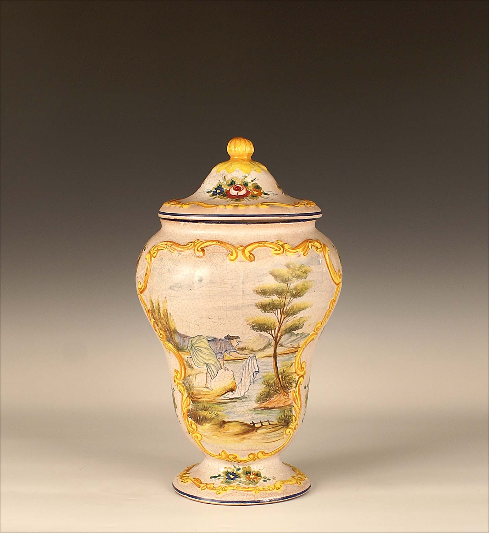 Potiche in maiolica dipinta in policromia a raffigurare paesaggi a motivi...
