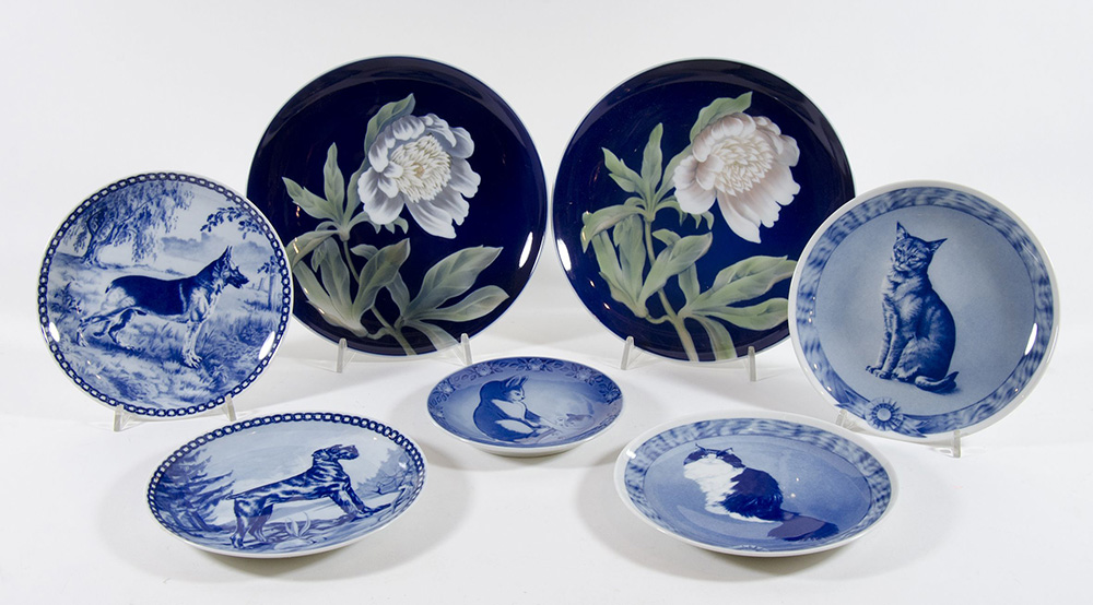 Lotto di 7 piatti in porcellana policroma tra cui Royal Copenhagen.