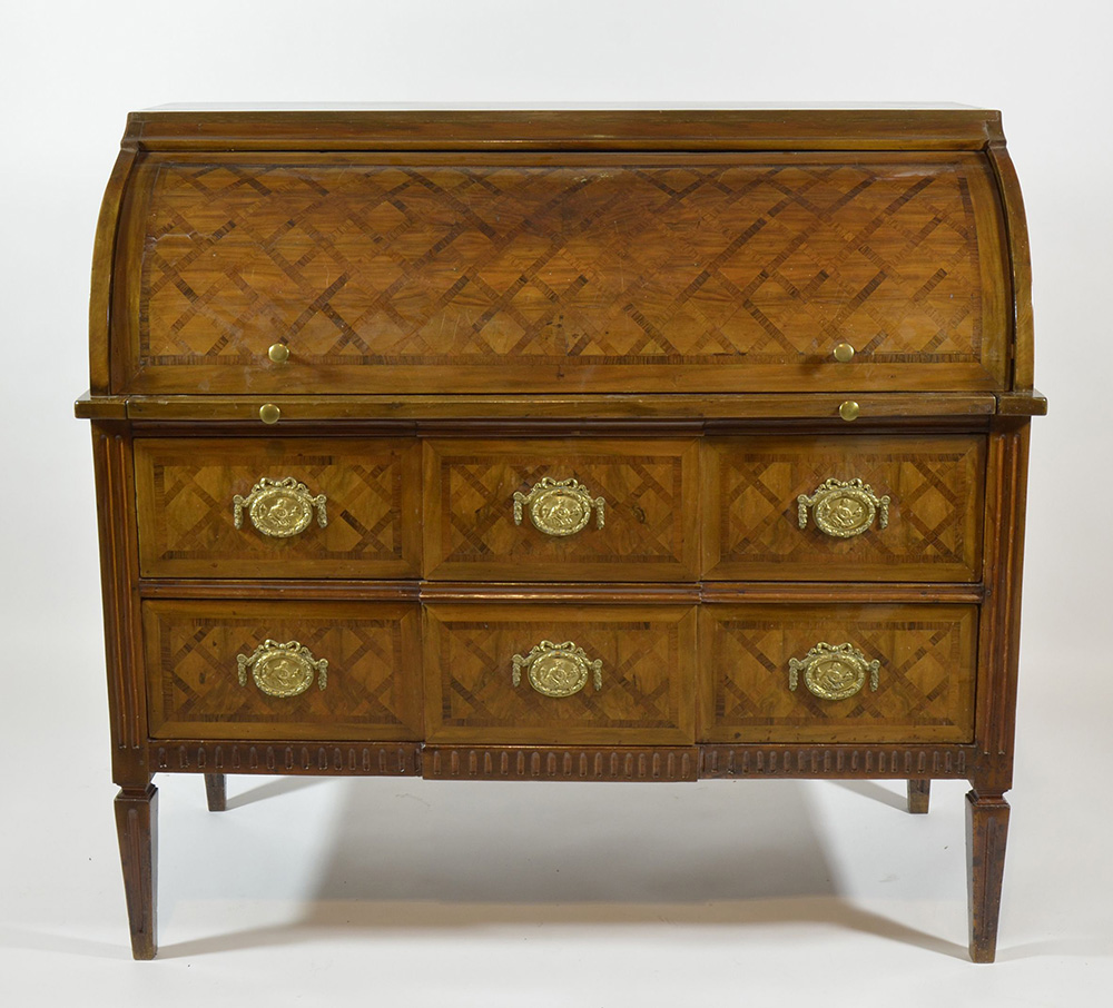 Scrivania apribile a rullo e 2 cassetti, intarsi in legni vari a motivi geometrici. cm. 108x115x55.