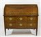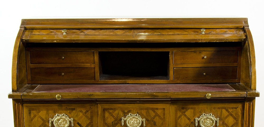 Scrivania apribile a rullo e 2 cassetti, intarsi in legni vari a motivi...