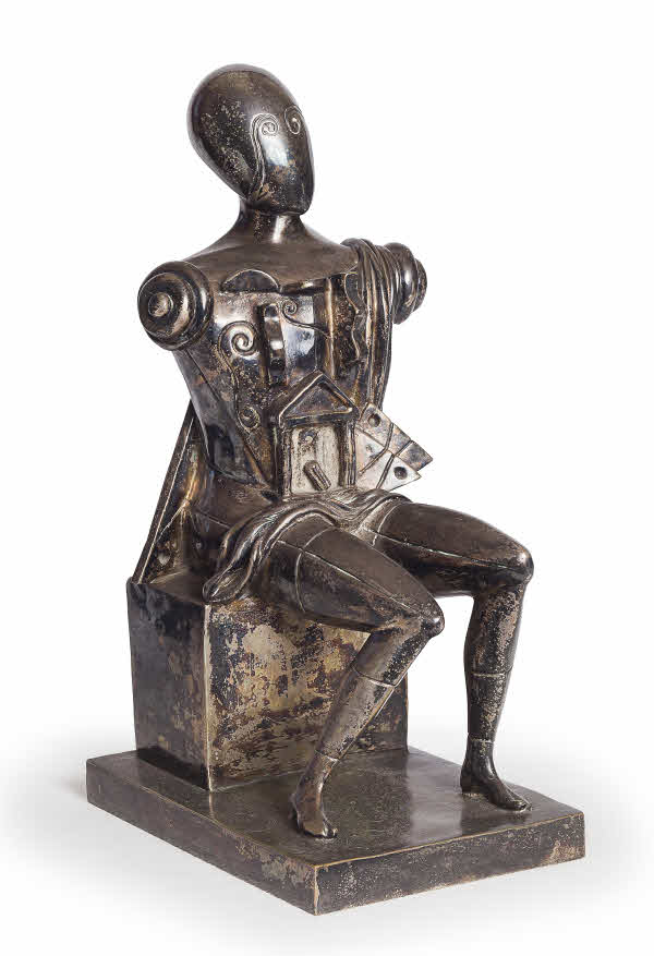 Giorgio de Chirico - I l Poeta Solitario – 1970 - scultura in bronzo patinato argentato, es. 1/9 cm.52x21x30. Punz. a secco delle fonderie GI.BI. ESSE, Verona Bibliografia: Bruni, Cat. Gen. II°Vol., n°295/3, 1972, b/n; Cat.Naz.Scult. Ita. Ed. Bolaffi, n°5, 1981, b/n; de Chirico Scultore, a cura di Giovanni Dalla Chiesa, Giorgio Mondadori Associati, p.93 e Copertina. Autentica su foto di Giovanni Magli. Esposizioni dell’opera: Milano 1970, n°178; Ferrara 1970, n°121, b/n; Milano 1971, n°4, b/n; New York 1972, n°74, b/n; Reggio Calabria 1972/73, n°44, b/n; Kamakura 1973, n°109, b/n; Parigi 1975, n°113, b/n. Firma, titolo e numerazione impresse.