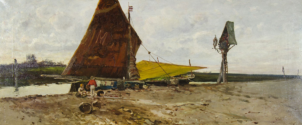 Giuseppe Garzolini Trieste 1850-1938 "Giovani pescatori a Chioggia" cm. 41x96 - olio su tela Firmato b. a d.