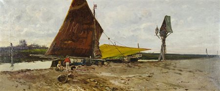 Giuseppe Garzolini Trieste 1850-1938 "Giovani pescatori a Chioggia" cm. 41x96...