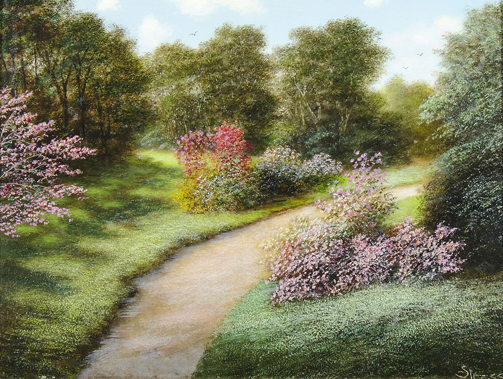 Guglielmo Stracca Gradisca 1899-Trieste 1979 "Vialetto in fiore" cm. 29x38 - olio su cartone Firmato b. a d.