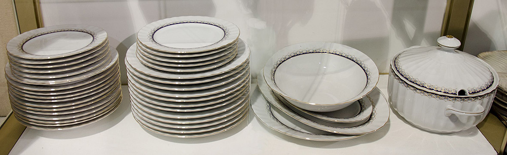 Servizio di piatti in porcellana con bordo dorato e blu composto da 38 pezzi.