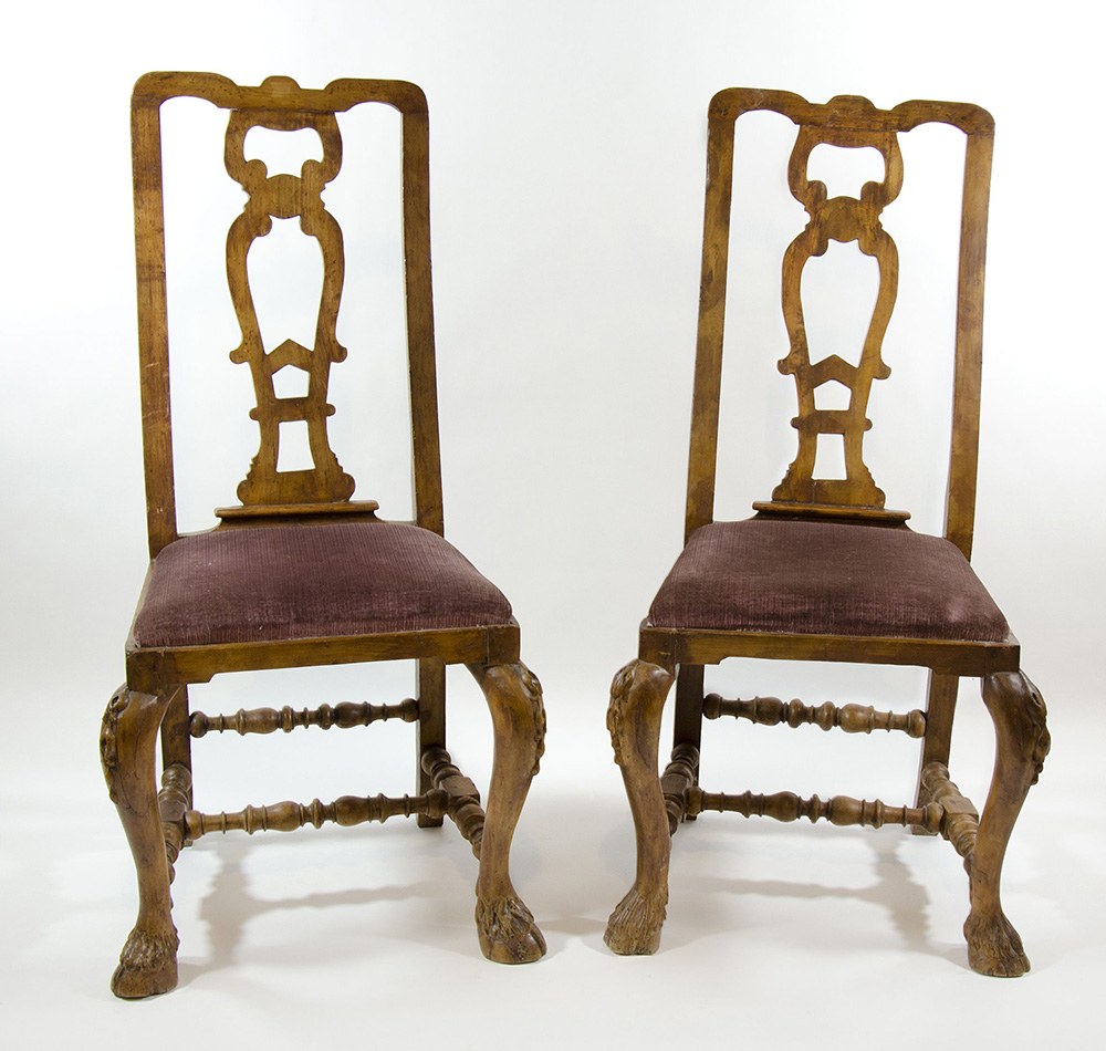 Coppia di sedie con alto schienale con cartella verticale scolpita.