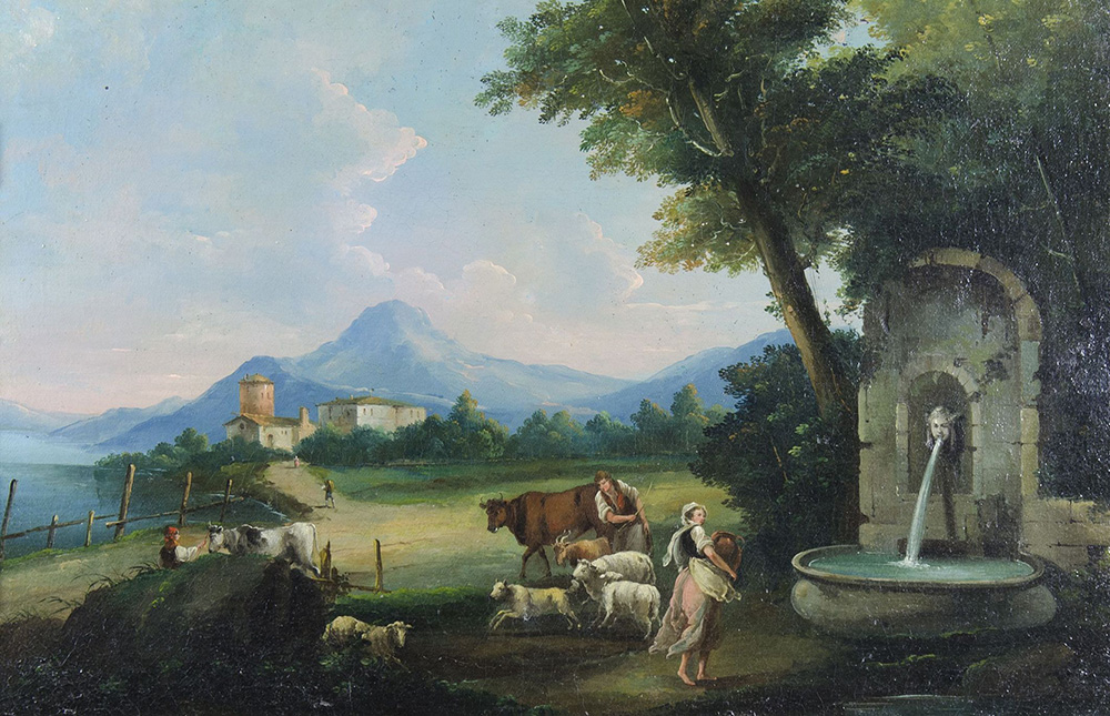 Maestro veneto inizio XIX secolo "Paesaggio con pastori" cm. 54x35 - olio su tela foderata Il dipinto presenta analogie con le opere di Giuseppe Bernardino Bison (1762-1844).