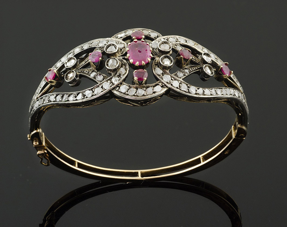 Bracciale rigido in oro giallo e oro bianco con diamanti e rubini. gr. tot 22,2.