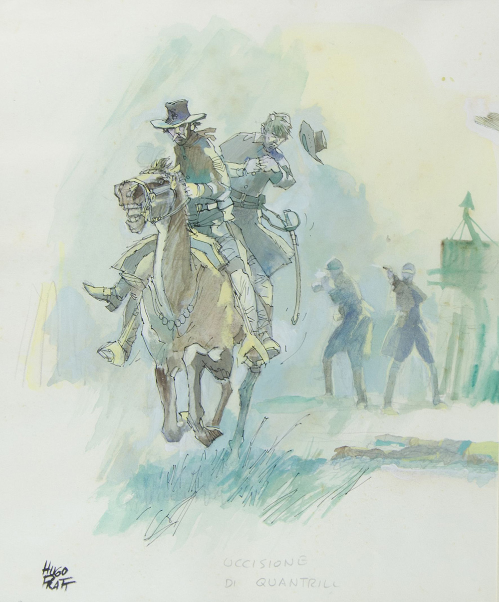 Hugo Pratt 1927-1995 "Uccisione di Quantrill" cm. 34x28 - tecnica mista su carta Firmato b. a s.