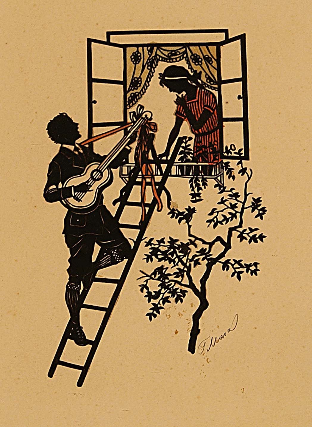 Scuola tedesca, inizi del XX secolo, "La serenata", silhouette e tecnica mista, cm. 24x18, firmata in basso a destra.