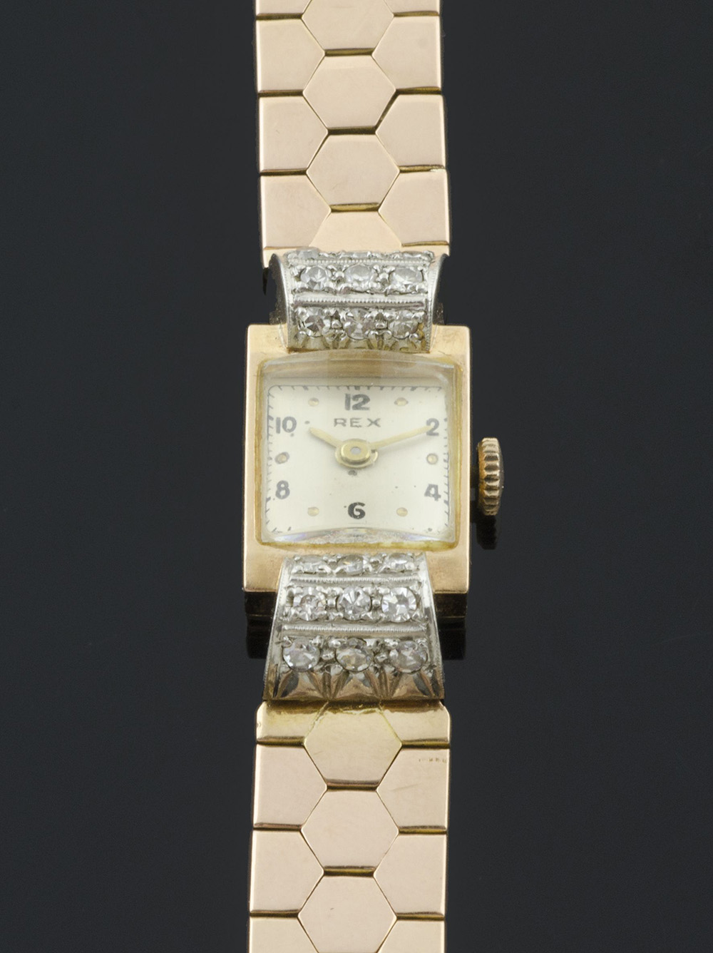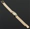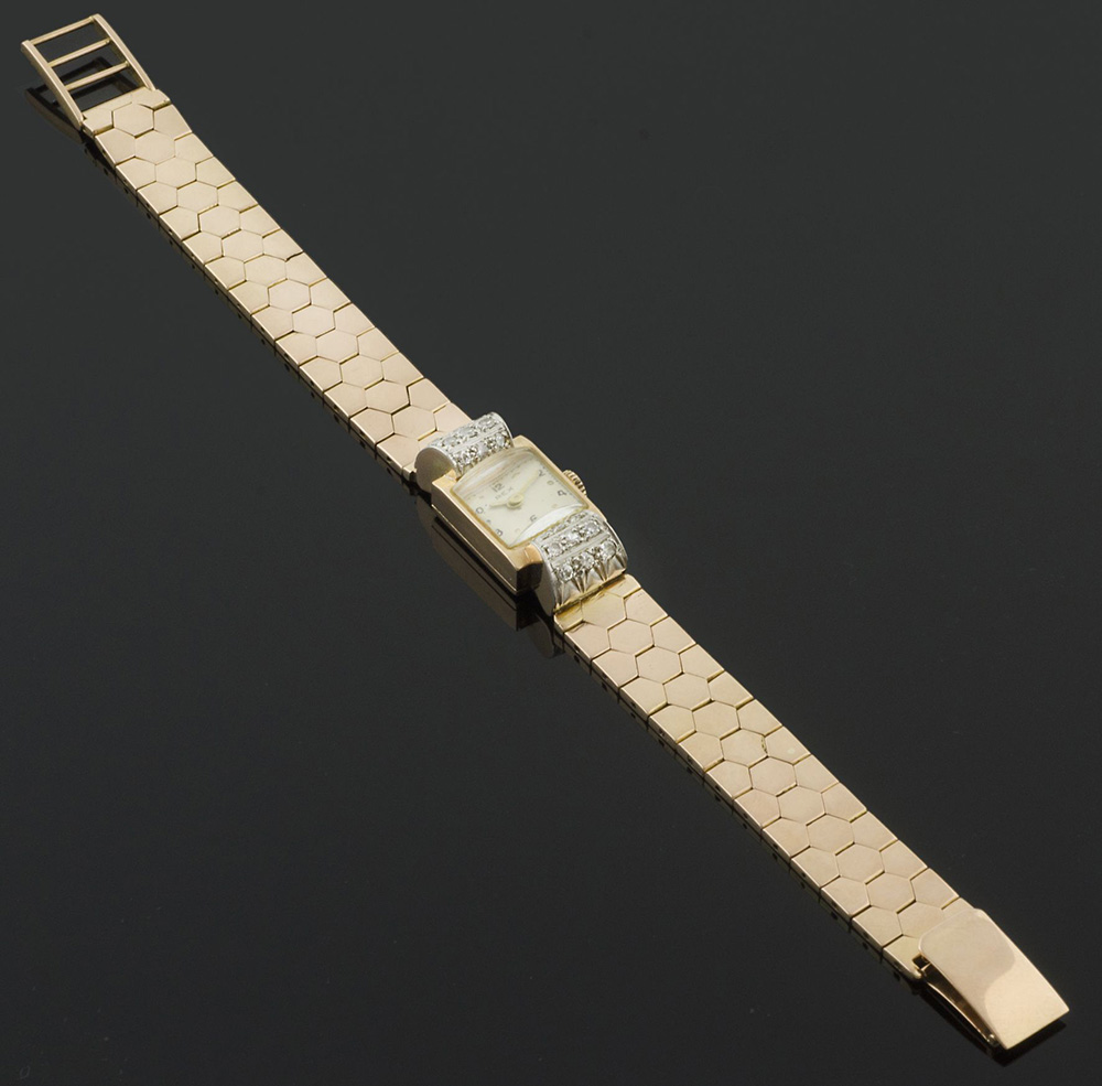 Orologio da polso da donna con quadrante quadrato entro cassa in oro giallo con alle estremità file di diamanti, cinturino in oro giallo. gr. tot 45,3.