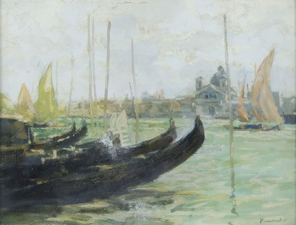 Cosimo Privato 1889-1971 "Gondole all'ormeggio" cm. 30x40 - olio su cartone Firmato b. a d. Al retro etichetta Mostra personale dell'Artista, Galleria Bordin Padova 1948.