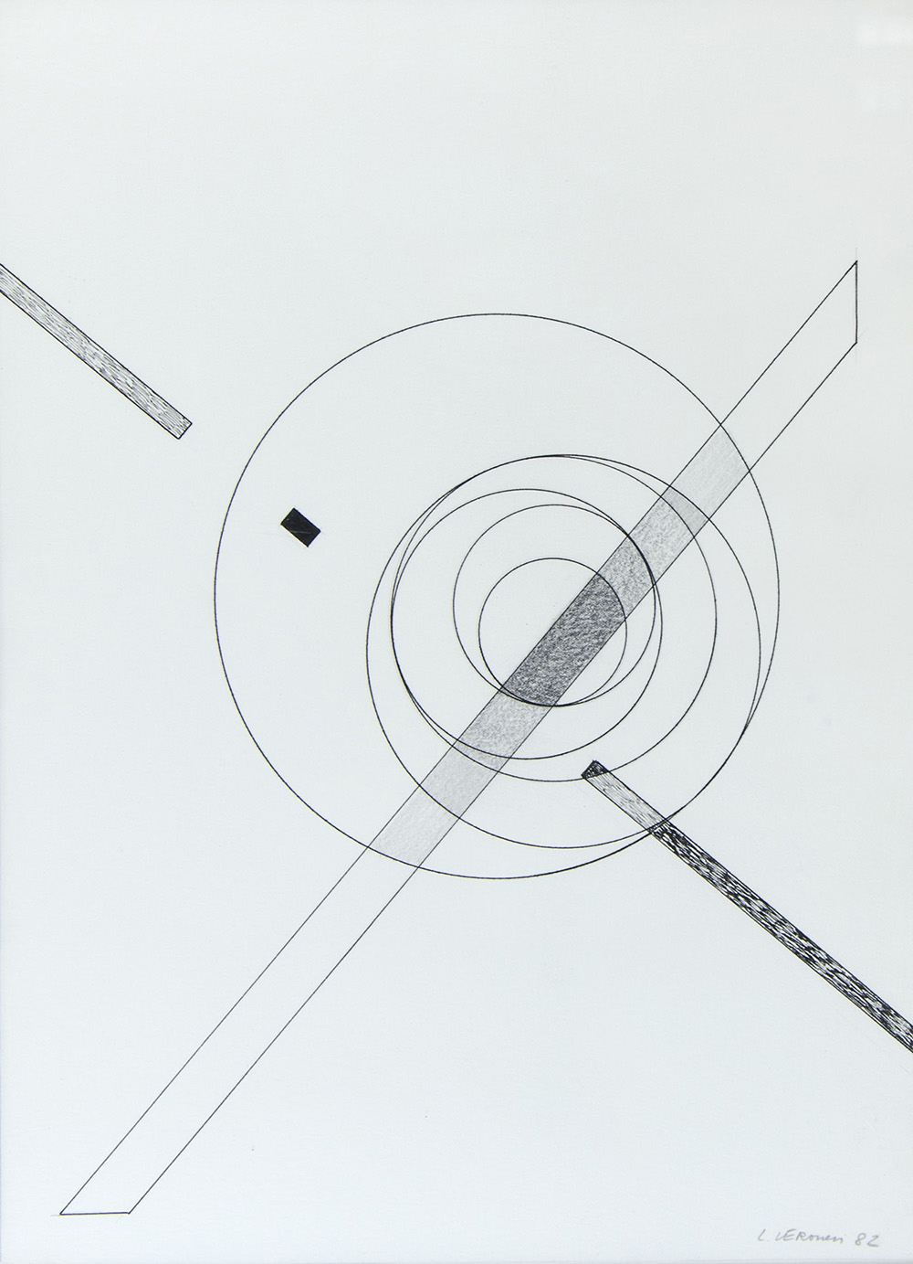 Luigi Veronesi 1908-1998 "Cerchi e forme" cm. 43x31 - china su carta Firmato b. a d. e datato '82. Autentica dell'Artista su fotografia.