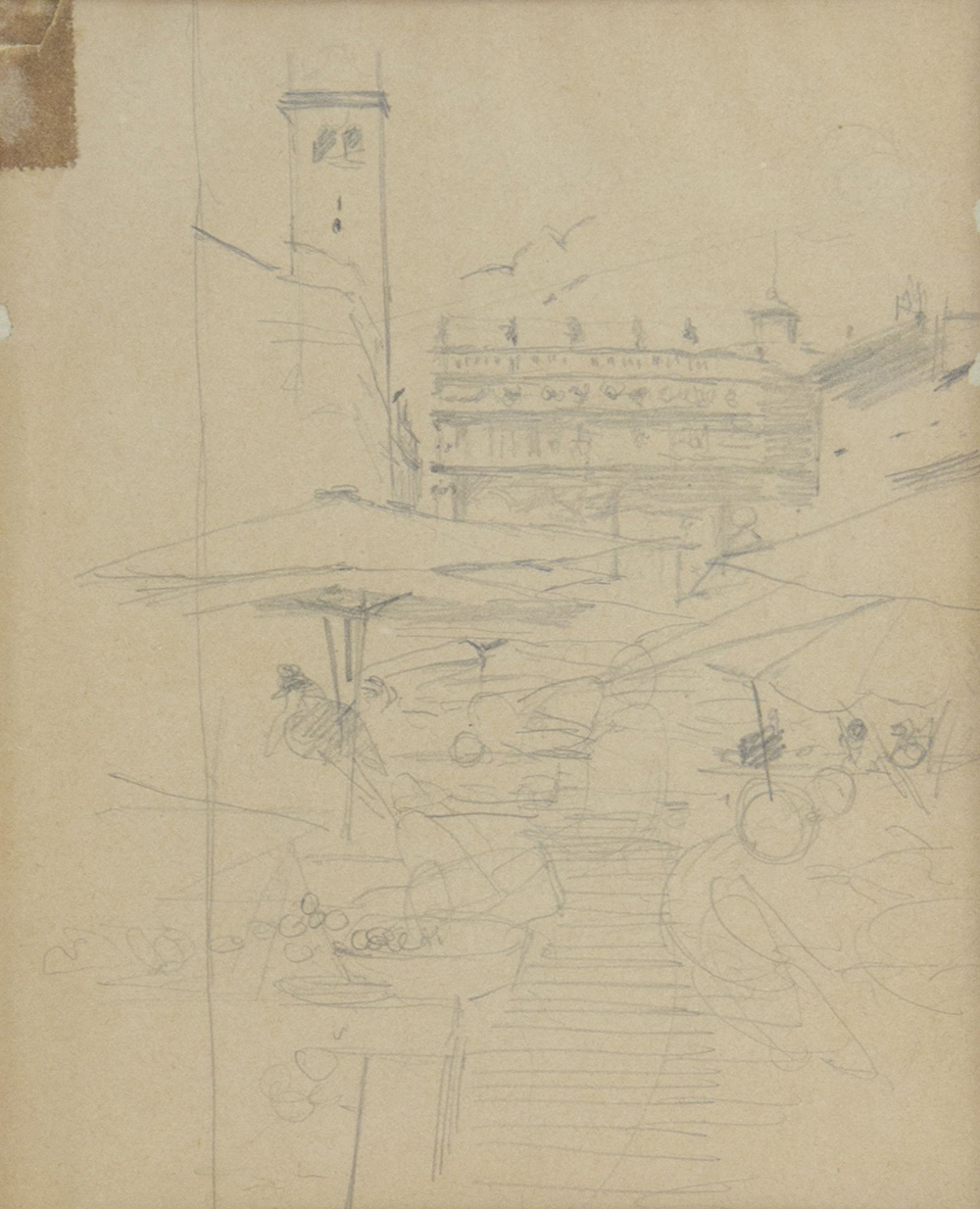 Giovanni Boldini 1842-1931 "Mercato a Ferrara" cm. 18x14 - matita su carta Al retro timbro Prandi Reggio E. Pubbl.: catalogo "Incisioni originali italiane e straniere dell'800 e moderne, acquerelli e disegni", Libreria Antiquaria Prandi Reggio Emilia