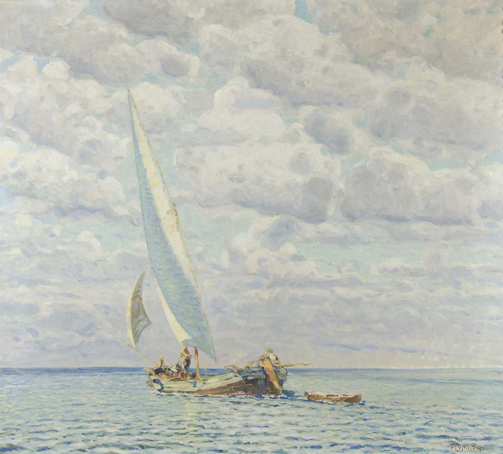Ugo Flumiani Trieste 1876-1938 "Pescatori al largo" cm. 80x90 - olio su tela Firma non coeva b. a d.